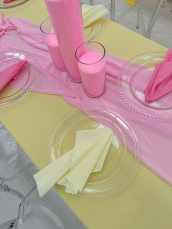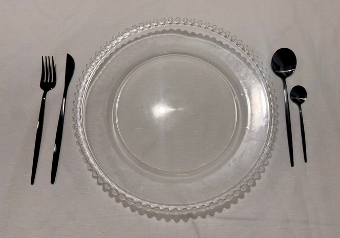 Elevate your event with our table ware hire! Our clear charger plates match any event styling! Choose from gold or black cutlery and any napkin colour of your choice!